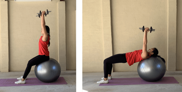 For example, try performing a seated dumbbell shoulder press on an exercise ball. You will find that your body, especially the core muscles, have to work harder to stabilise itself.