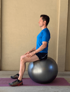When doing sitting exercises, the general rule that we go by is you need to sit on top of the ball with your feet flat on the ground to have good balance and support yourself safely. Secondly, have the hips slightly higher than the knees so you can maintain the natural curve in your lower back. Finally, this sitting position forces you to engage your core muscles to maintain an upright posture.