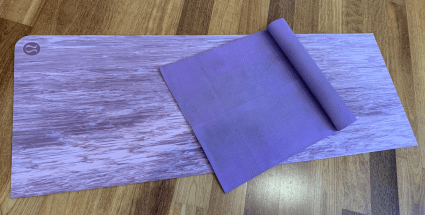 Yoga mats are generally the same size as the standard exercise mats but thinner, 5 to 8 mm (1/4”) thick, and have a non-slip surface. Yoga mats are designed to provide yogis with a non-slip stable surface, so they feel grounded when performing different yoga poses.